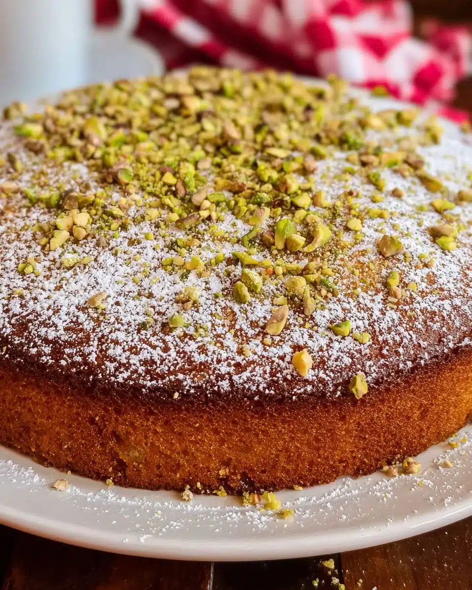 The Italian Pistachio Cake shines when served simply: a light dusting of powdered sugar and a few crushed pistachios on top is all you need to let the nutty flavor sing. Serve slices with a scoop of vanilla ice cream or a spoonful of lightly sweetened ricotta for an extra Italian touch. For an elegant dessert, plate a slice with a drizzle of honey and a scattering of fresh berries to cut the richness and add bright color. Coffee or an espresso pairs beautifully with the cake’s toasted nut flavors for a classic afternoon treat.