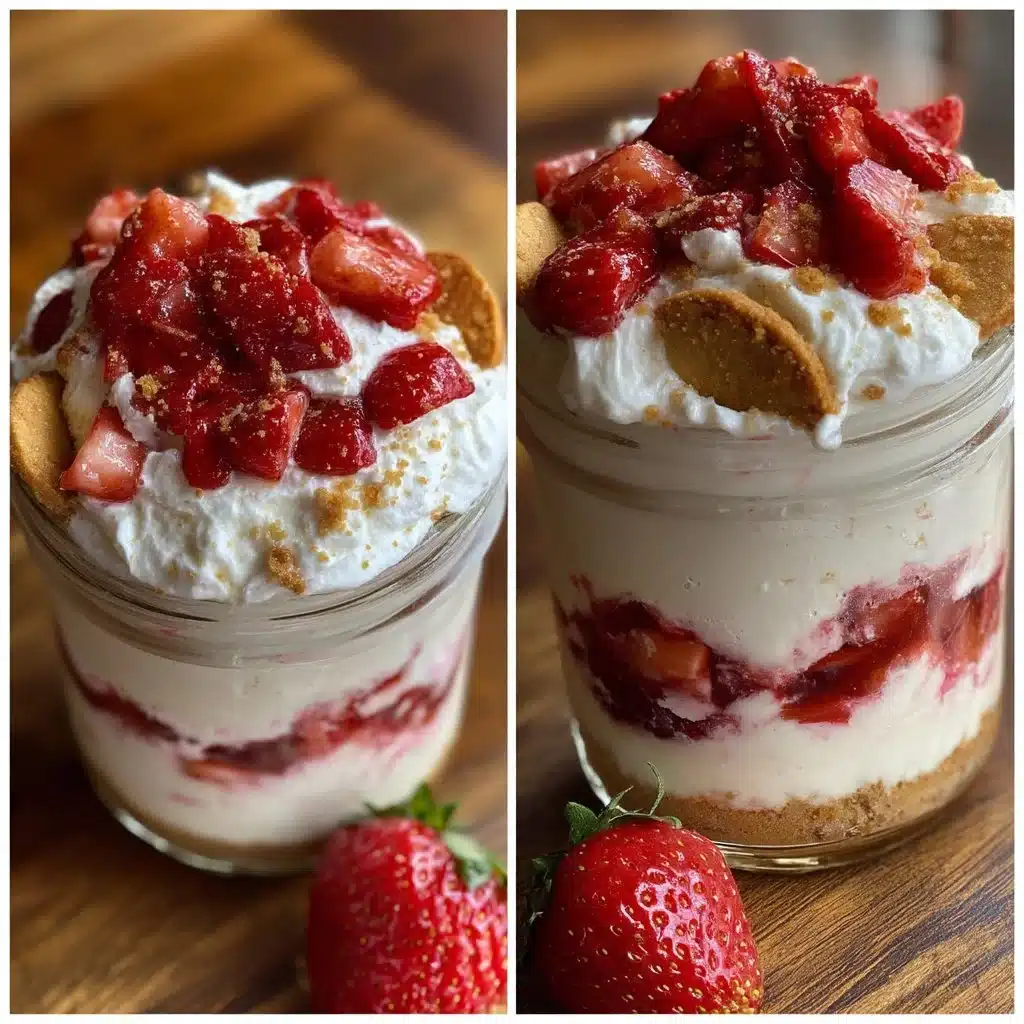 These No-Bake Strawberry Mascarpone Cheesecake Jars shine when served cold and simple. Present them straight from the fridge with a few whole berries and a mint leaf for color. If you like a touch of sparkle, dust a little extra powdered sugar over the top right before serving or drizzle a spoonful of reduced balsamic for an adult twist. For gatherings, set out a small tray with spoons and labels so guests know they’re getting a creamy, fruity no-bake treat.